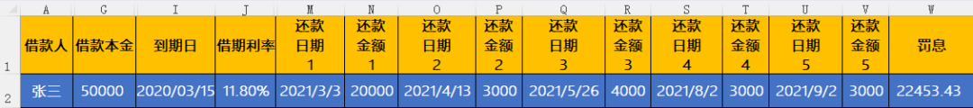张三到期未偿还贷款本息,产生罚息和复利。经过银行催收,张三陆续偿还5次本金,还款数据如表3所示。计算罚息时,可在W2单元格输入函数“=ROUND(SUM(G2*(M2-I2),(G2-N2)*(O2-M2),(G2-N2-P2)*(Q2-O2),(G2-N2-P2-R2)*(S2-Q2),(G2-N2-P2-R2-T2)*(U2-S2),(G2-N2-P2-R2-T2-V2)*(TODAY()-U2))*J2*1.5/360,2)”。罚息利率按借期利率的1.5倍计算,罚息计算至“今天”,若需计算至指定日期,可将函数中的“TODAY()”替换为含指定日期的单元格并设置绝对引用。若还款次数更多,可按此函数逻辑类推。复利计算逻辑与罚息一致,此处不再赘述。