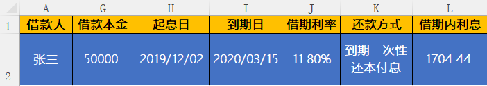假设张三向某银行借款,贷款基本要素如表2所示,要计算借期利息时,可在单元格L2输入函数“=G2*(I2-H2)*J2/360”(借期天数计算遵循“含头不含尾”原则)。